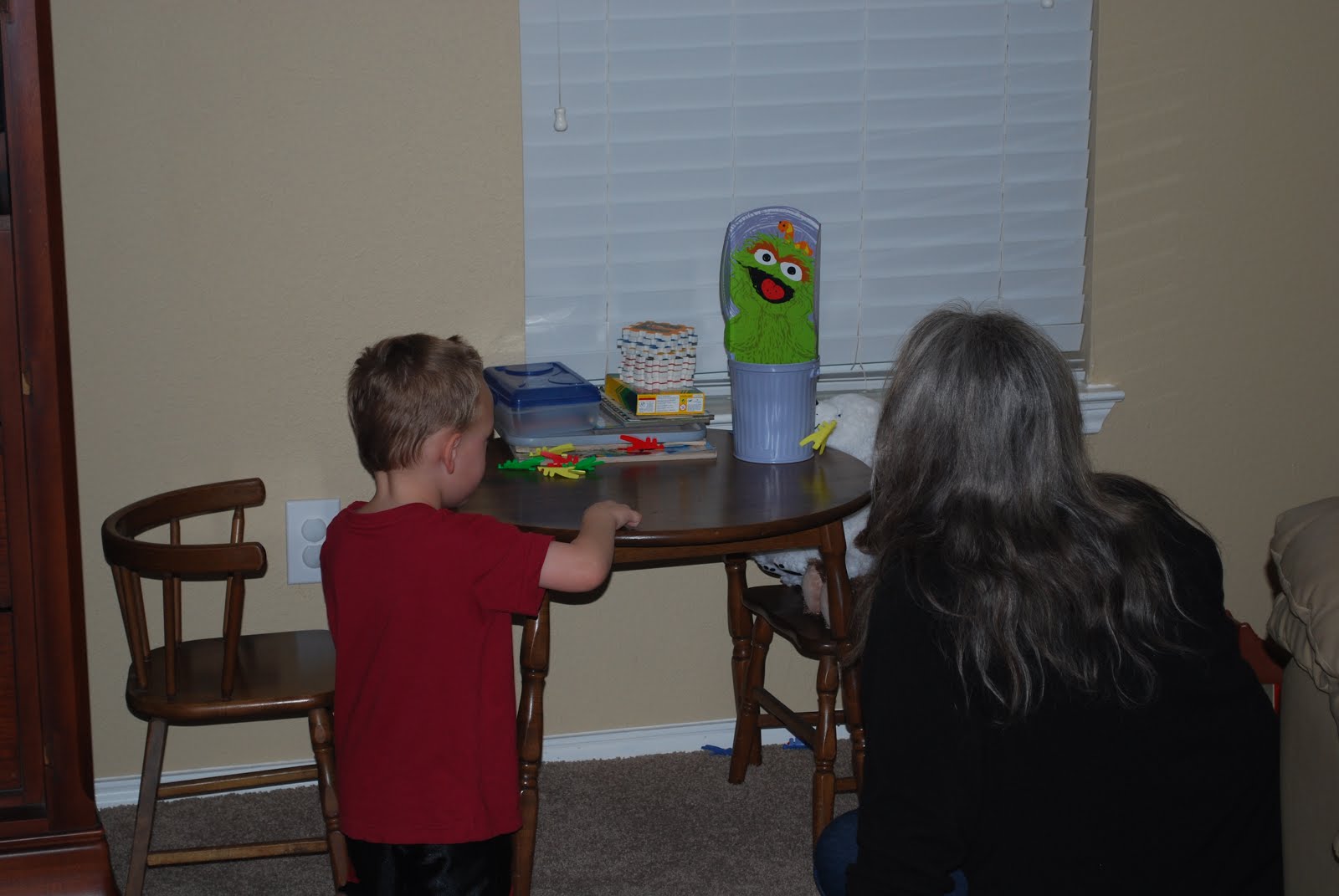 He is doing awesome! He is a big eater. He is drinking about four seven ounce bottles a day, usually two of them formula and the other two breast milk. He is eating Stage 2 baby foods three times a day and sometimes at supper time, he eats two of the containers of food. I really have not found any foods that he completely dislikes, however he does favor fruits over anything. (Like his momma, he likes the sweet stuff.) He is taking about two naps a day at school and we are lucky if he sleeps more than 30 minutes at each nap. He always falls asleep on the way home from school, but generally wakes right back up once we get home. He is still a great sleeper, unless he has a stopped up nose, and then he thinks he shouldn't sleep at all (which is what happened last night). He is a happy boy and loves to be around other people. He is definitely a keeper!